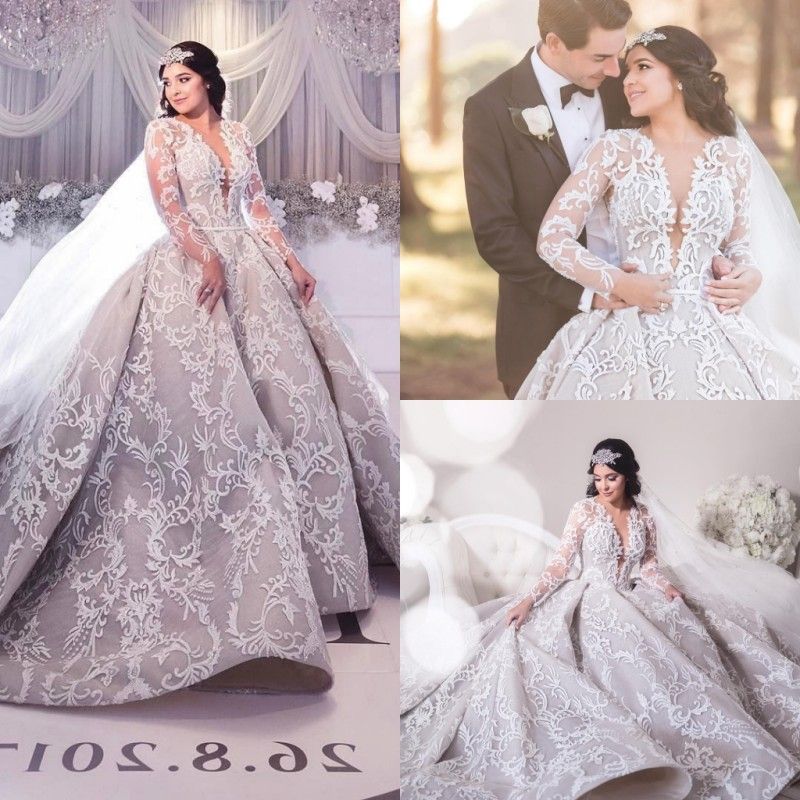 Lace Ball Gown Dubai Wedding Dresses 2018 Long Sleeve Lace Appliqued Saudi Arabia Bridal Gowns Sheer Plunging Neckline Wedding Dress Two Piece Wedding