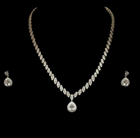 Cubic Zirconia Artificial Silver Necklace Set Bridal Necklace Set Artificial Silver Set Bridal Necklace Set